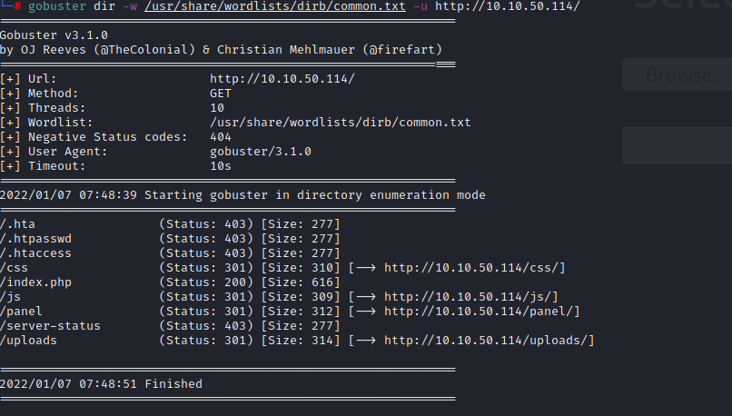 nmap has found that the target is running ssh and a web server on port 80. I can navigate to that website but it just shows text saying “root@rootme:~#” . So its time to try and find some directories on the webserver using gobuster.
