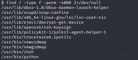 By doing the ‘id’ command we will see that we are not root, so now our goal is to find a way to get root using some privesc techniques. By using this command “find / -type f -perm -4000 2>/dev/null” we will search for files with suid bit sets so we can check to see if any are exploitable. A good website that can help with this is GTFOBins