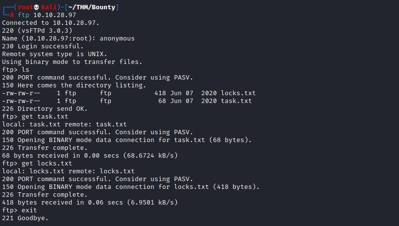 After this scan I connected to the ftp port and logged in as anonymous to download the files.