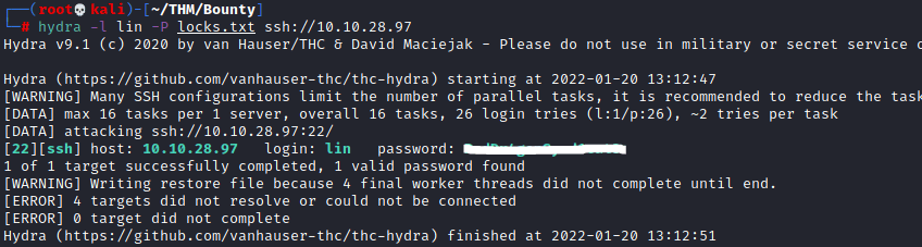 Using the wordlist and username ‘lin’ I am going to try and bruteforce the ssh login using a tool called hydra!