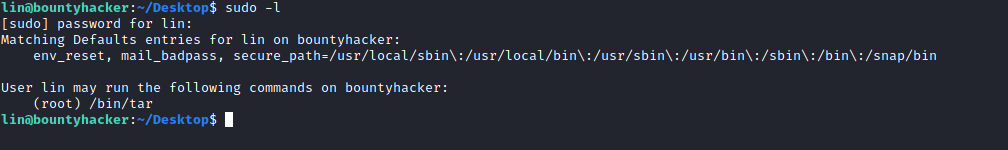 Now we have user its time to escalate our privileges so we can read the root flag. If we do “sudo -l” we find that we can run /bin/tar as root. Using gtfobins we can find a way to privesc using this.