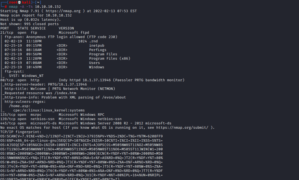 First I conducted an nmap scan of the machine. The nmap scan shows us that ftp,smb and a webserver is running.