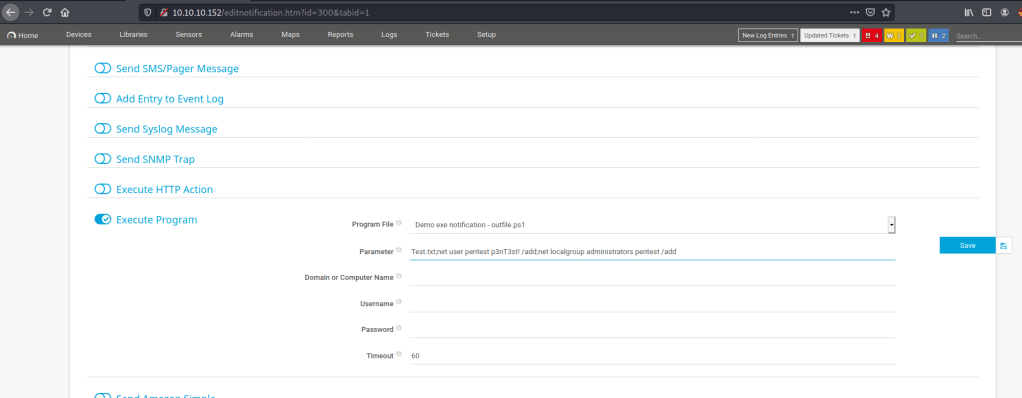 As you can see the notification tool for prtg allows us to execute a powershell command so from here I am going to add a user and then add them to the administrator group as well. I saved this and then found a way to run it from the notification page to execute our script.