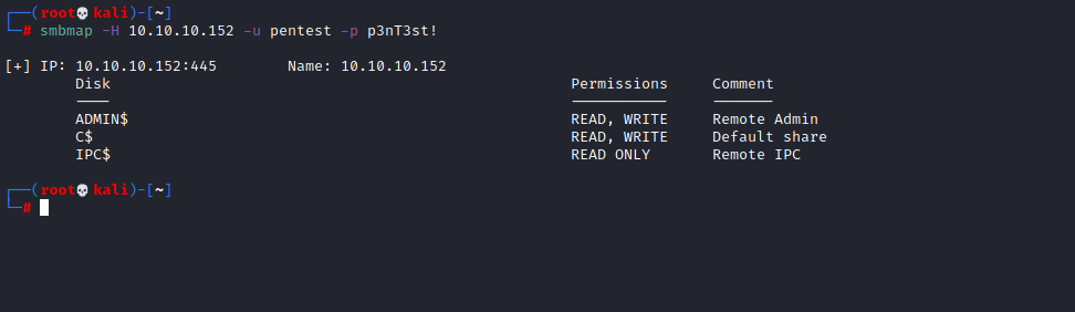 To test that it worked I am going to try and login through smbmap to see if the new credentials work.
